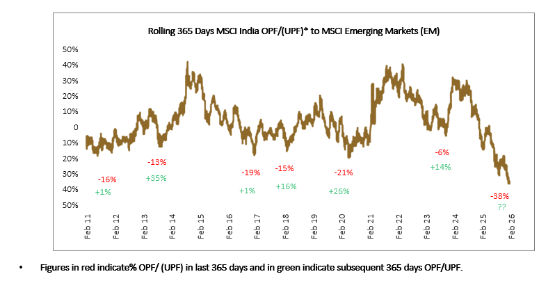 Periods where MSCI India has underperformed MSCI EM have historically been followed by phases of recovery and relative outperformance.