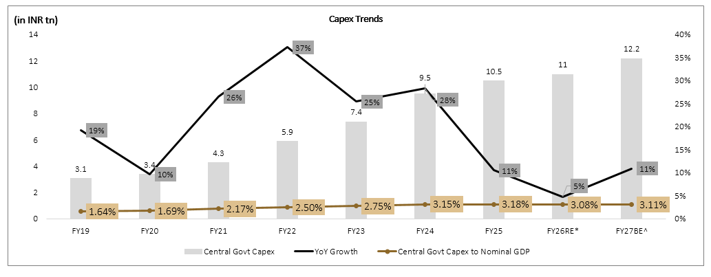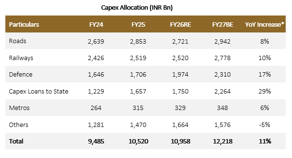 Roads, railways, and metros continue to account for over half of total capex, while defence emerges as a notable growth area, supported by indigenisation and domestic sourcing initiatives.